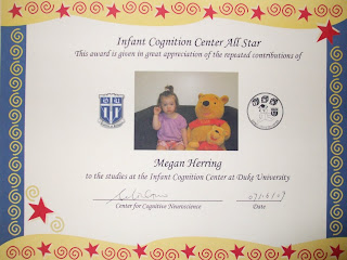 On Monday night, Megan woke up around 1 or 2am screaming. Normally, I let her try to work it out and go back to sleep on her own, but that wasn't happening. So I went in, comforted her, and went back to bed. Then around 5 am - same thing. In my groggy state, I didn't really think too much about why she was up, I just wanted her (and me) back to sleep. So when I was changing her diaper after we got out of bed (again) for the day, I noticed some white inside her mouth, and sure enough...new teeth! I think I've mentioned before that her teeth only seem to come in around 3am...